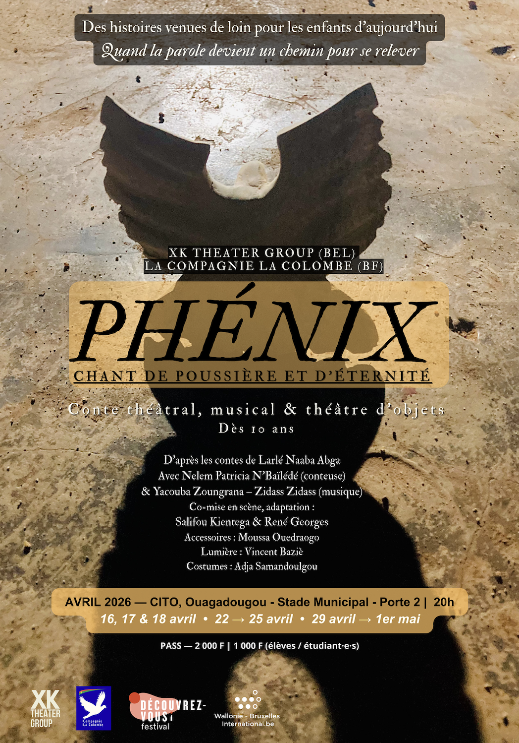 Le projet PHÉNIX - Chant de poussière et d’éternité, porté par l’XK Theater Group (Belgique) en partenariat avec la Compagnie La Colombe, est soutenu par le Carrefour International de Théâtre de Ouagadougou (CITO), le Grâce Théâtre (Ouagadougou, Burkina Faso) et le Festival Découvrez-vous ! (Belgique). Il bénéficie du soutien de Wallonie-Bruxelles International.